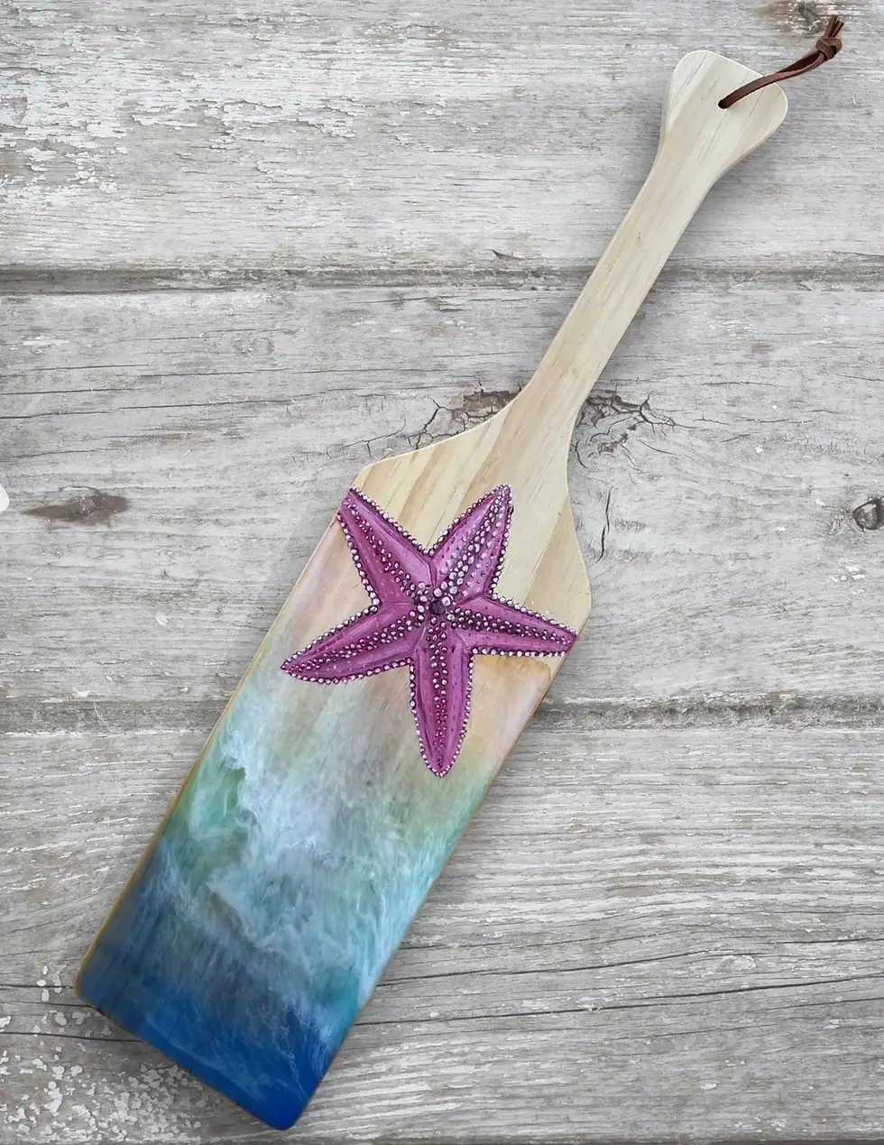 These decorative paddle boards are hand crafted to perfection. Finished with a durable resin beach wave effect and polished off with your choice of design! Don't see a design you are looking for or want the design in a different color? No worries! Just reach out and we will craft the perfect piece just for you! …